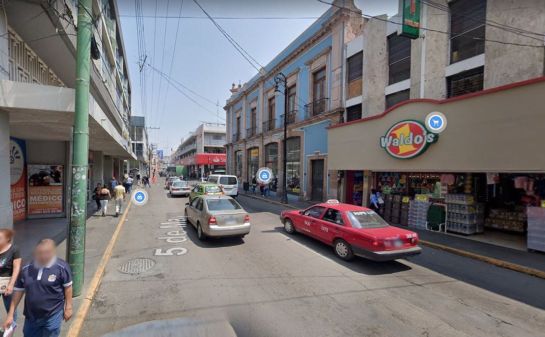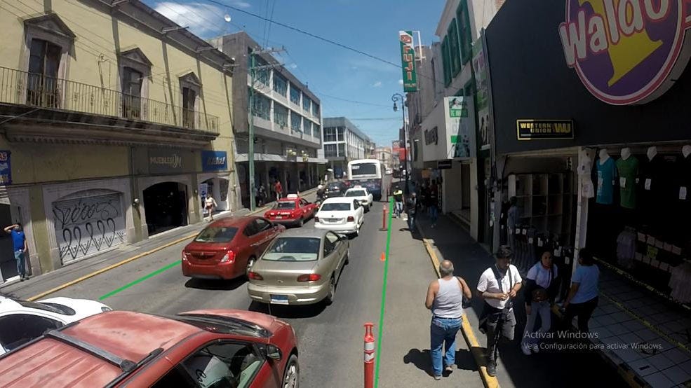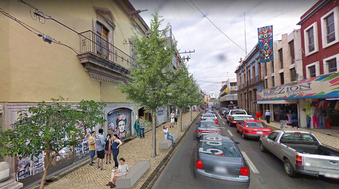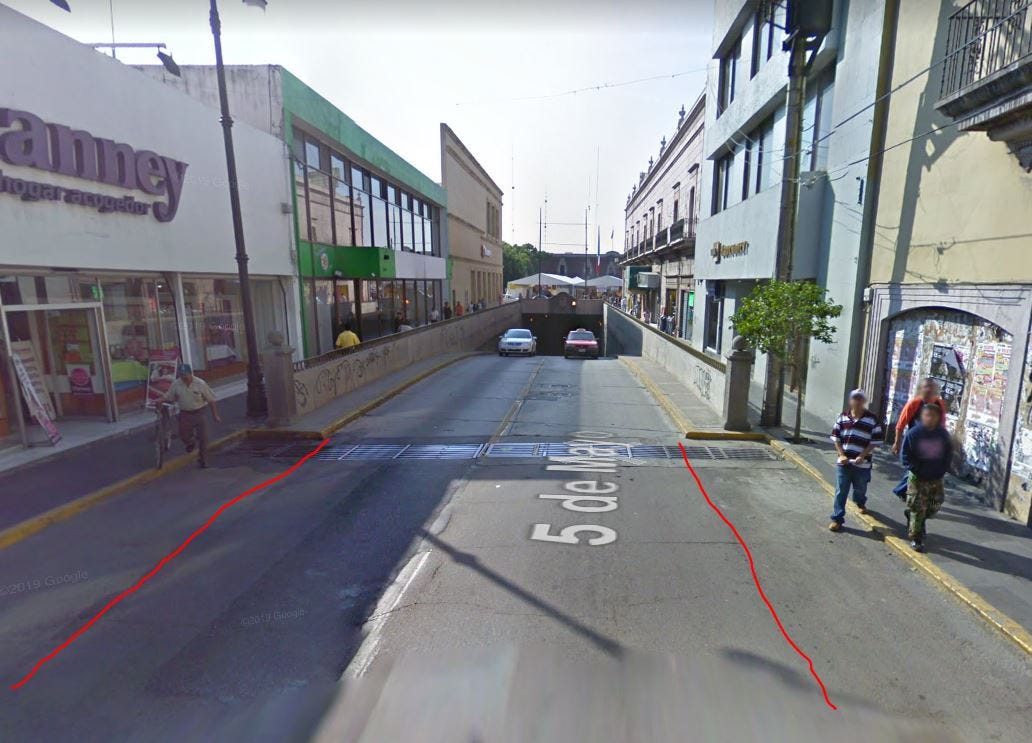 Y justo todo esto nos dirige a la pequeña intervención urbana realizada el pasado Día Mundial del Peatón por activistas de la ciudad. En 5 de Mayo entre Ignacio Allende y Rivero Y Gutiérrez se ampliaron las banquetas sobre la sección vehicular. Esto sobre un carril de circulación, mismo que solo existe en la misma cuadra (una antes y una después solo existen dos carriles).