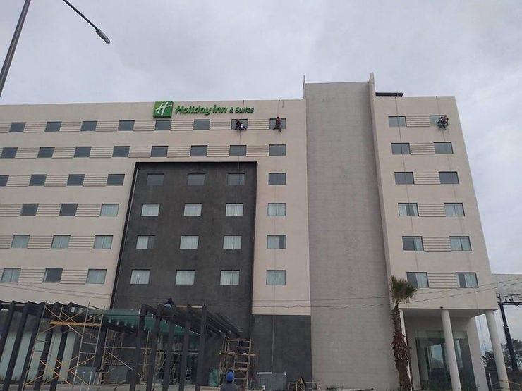 El hotel al sur de la ciudad sigue avanzando a buen paso. La fachada ya se ve prácticamente terminada, muy probablemente se esté trabajando en los interiores y mobiliario. Su inauguración en marzo de 2019 parece que será una realidad. En la foto nuestros amigos de Garma trabajando en la fachada con el sistema de Rope Access.