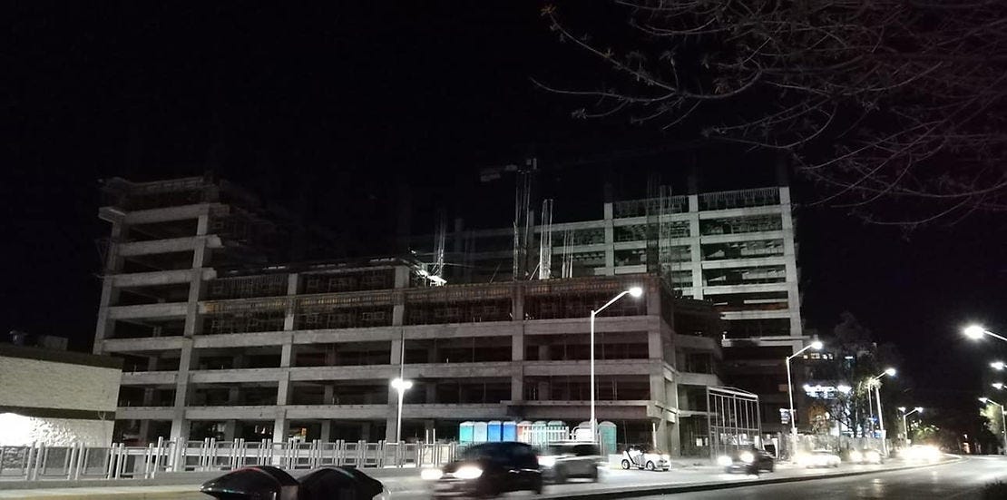 Sigue la construcción del complejo médico. El ritmo es normal para una construcción en concreto. Cada vez se nota más el gran volumen de los edificios.