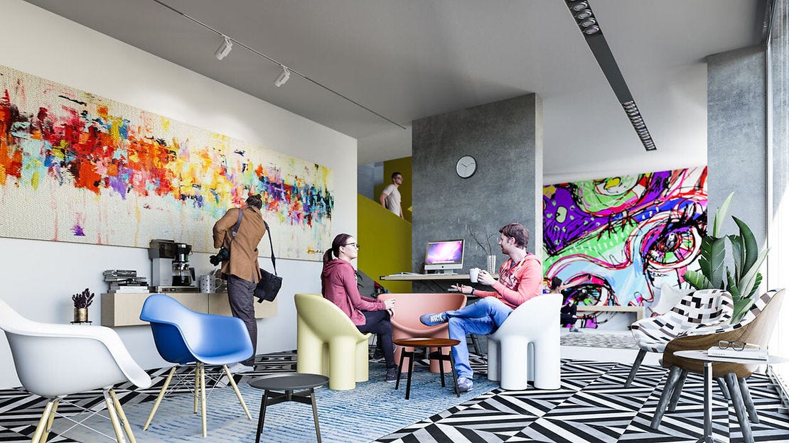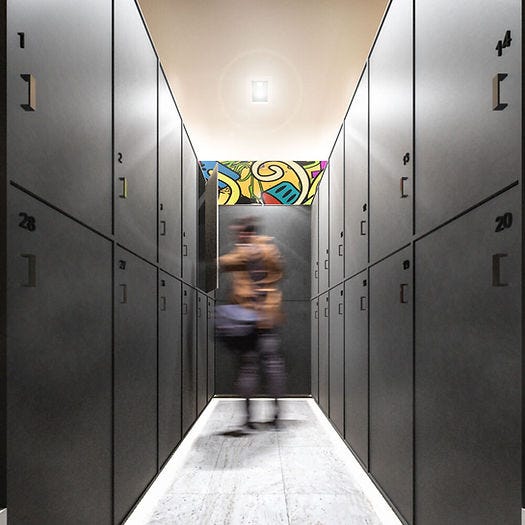 La planta baja es considerablemente permeable. Pues junto al ingreso peatonal hay un área tipo Coworking denominada como Snack N' Books. Esto asegura algo de actividad en la calle, y sumado a los balcones (que se ven muy agradables) ayudan a mantener la calle "percibida" y segura (esto es un mecanismo de seguridad pasiva). Además a veces es útil poder recibir personas o despachar en un sitio como el Snack N´Books sin requerir que alguien entre a la privacidad del hogar.