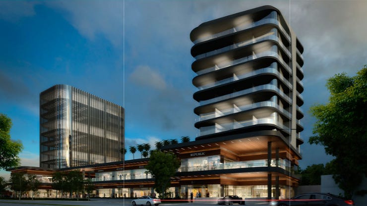 El proyecto consiste en un Stripmall de dos pisos de doble altura aparentemente. También parece tener una torre corporativa de 13 pisos. Contando las plantas comerciales se podría esperar una altura de alrededor de 70 metros. También se aprecia una torre de departamentos en la parte posterior del desarrollo.
