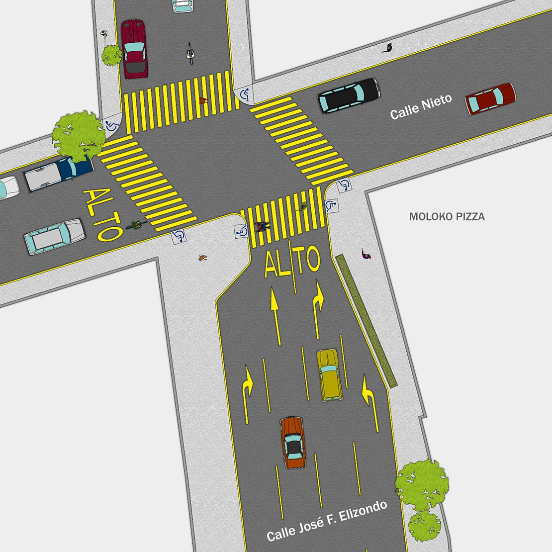 Con una intervención táctica fruto de la colaboración de la sociedad civil con el ayuntamiento de Aguascalientes (y sus distintas dependencias), se ha delimitado el espacio que ocupará la nueva banqueta de la intersección de Nieto y José F. Elizondo, a un costado de las famosas pizzas Moloko.