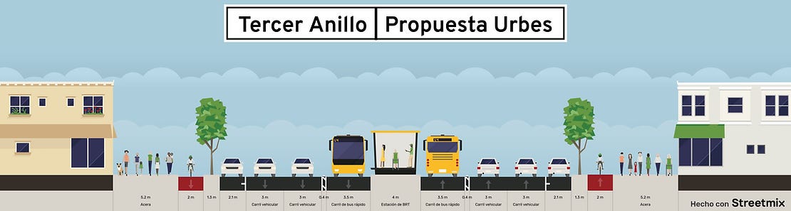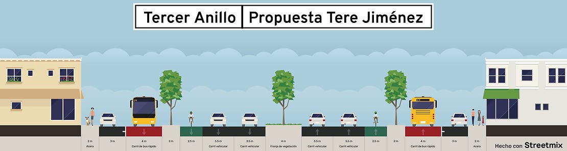 Por esto me parece atinado la inversión en una ciclovía y carril confinado de transporte público. Sin embargo, la propuesta mostrada carece de sentido y no es funcional, quiero creer que solo se contrató algún renderista sin conocimiento para hacer un vídeo rápido y eso lo explica, pues se ve el render sobremontado a un vídeo de dron. Lo que si se debe de decir, se pasó con las banquetas, siguen siendo ridículamente pequeñas. Pero aquí abajo dejo lo que considero se debería hacer.