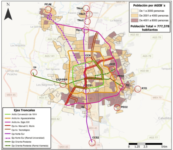Por otra parte, parecería ser que se planea un sistema de Bus Rapid Transit (BRT) en tercer anillo, similar al Metrobús en la Ciudad de México. No digo que tercer anillo no deba de tener un BRT, pero no es una línea prioritaria. Antes se deben de hacer las líneas radiales, o sea esas que comunican periferia con centro. Ya existe un proyecto bastante trabajado, con dos troncales una norte-sur y otra oriente-poniente. Estas permitirían ofrecer gran capacidad y velocidad del transporte al centro de la ciudad, lo que podría detonar proyectos de peatonalización y redensificación. Además, el centro sigue siendo el principal atractor de viajes. Si se hace se desviarían recursos que podrían ser utilizados en estos corredores. Pues Tercer Anillo, de Av. Universidad a la entrada de Jesús María hasta Av. De los maestros tiene casi 25 km, mientras que las dos troncales mencionadas tendrían 27 km, o sea sería una inversión bastante similar y con mayo beneficio.
