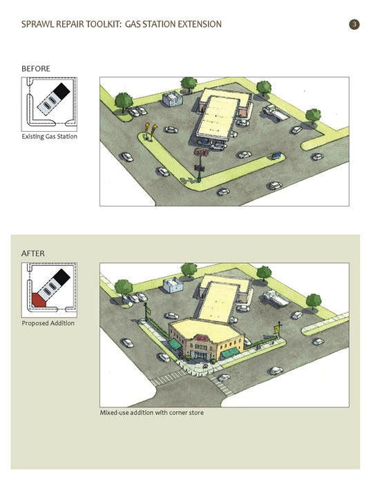 Si bien las gasolineras son necesarias en las ciudades, existen maneras de construirlas sin que el impacto a la ciudad sea tan terrible. A continuación muestro una imagen de del kit de reparación de suburbios (urban sprawl repair kit).