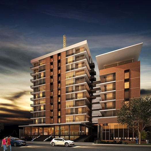 Este proyecto próximo a terminarse consiste en dos torres de 15 niveles. Su característico recubrimiento en color rojo y su volumen las hacen destacar del resto de los edificios de la zona. Sin duda hay interés por desarrollar la West End y estas torres son reflejo de ello.