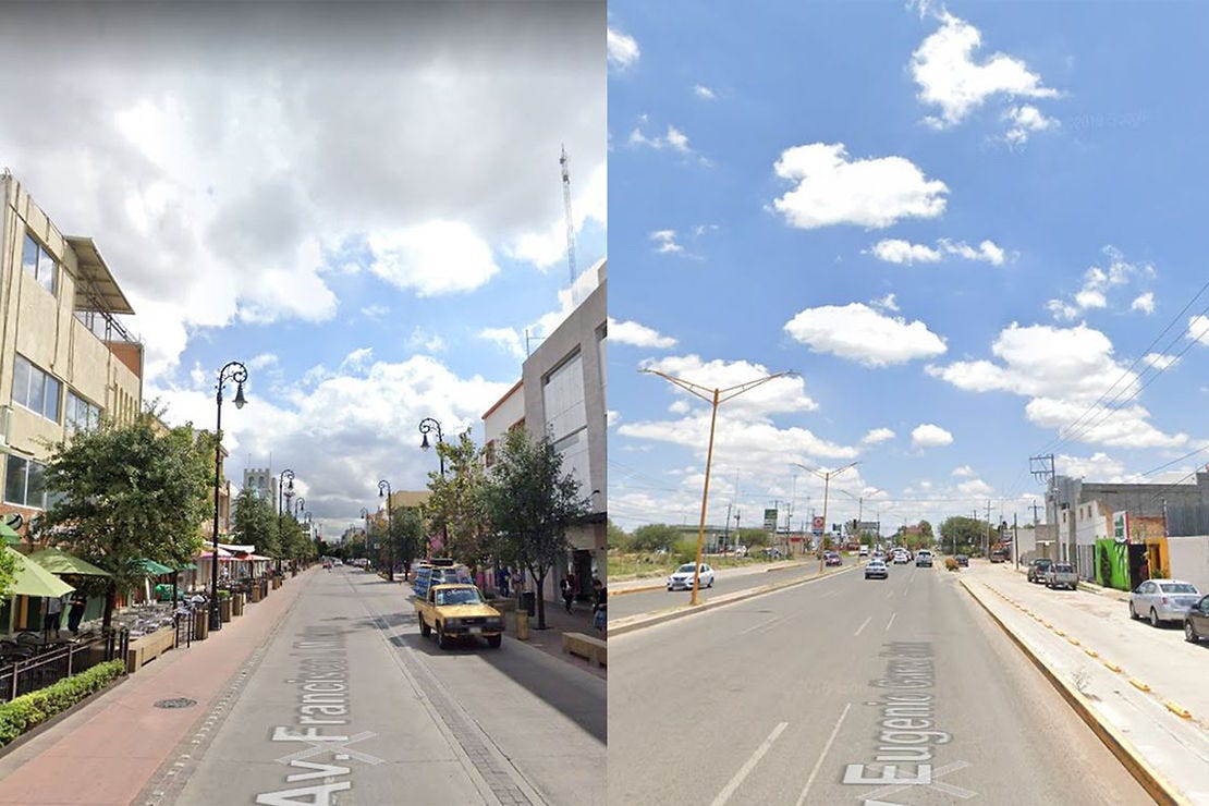 Quizá se hayan dado cuenta de muchas cosas que diferencian a ambas imágenes. Lo primero, Madero está completamente construida. Eugenio Garza Sada está repleta de baldíos. Mientras que en Madero el espacio se encuentra "contenido" entre las fachadas de los edificios en EGS la calle "fluye en el horizonte" no hay elementos verticales que marquen dónde inicia y termina.