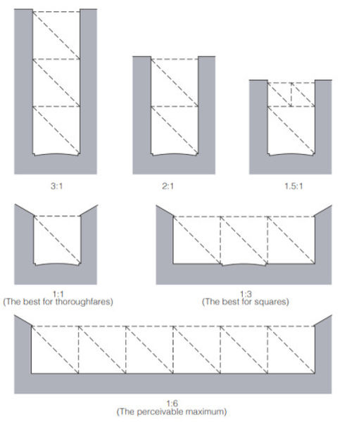 Ahora que sabemos la necesidad de calles con definición espacial hay que meternos a cuestiones matemáticas. La relación 1:6 es la mínima para que la calle se sienta contenida. En Aguascalientes la mayoría de construcciones tiene 1 o 2 pisos. Por lo tanto no hay problema con que las calles locales se sientan definidas. En las avenidas es mucho más difícil.