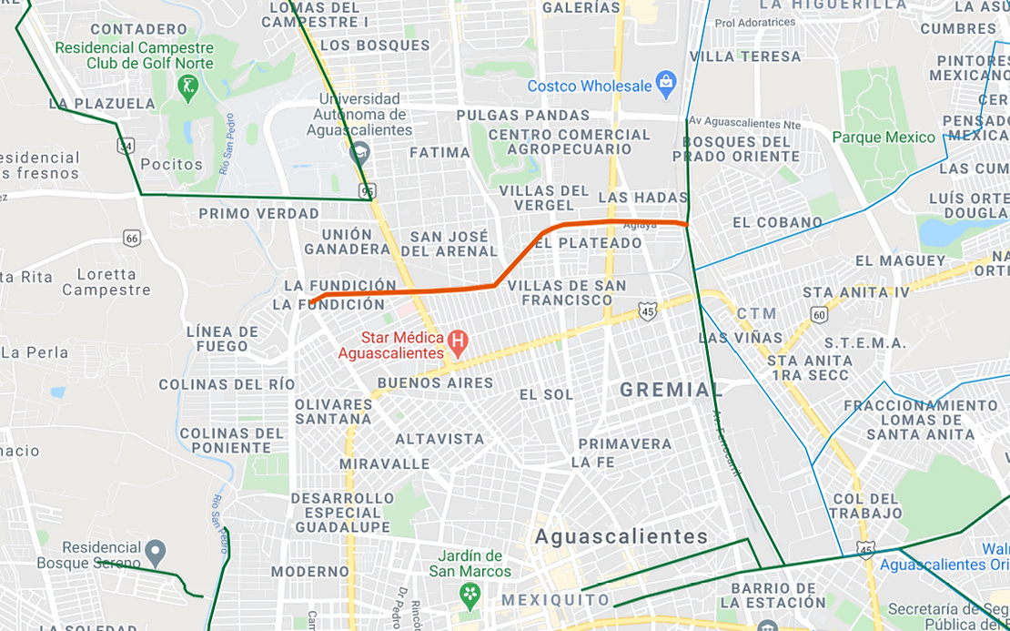 La ciclovía idealmente iría de Av. Fundición (casi Segundo Anillo) hasta Gómez Morín. Esto implicaría un recorrido de 3.20 km por sentido, dando un total de 7.40 nuevos kilómetros de ciclovía.