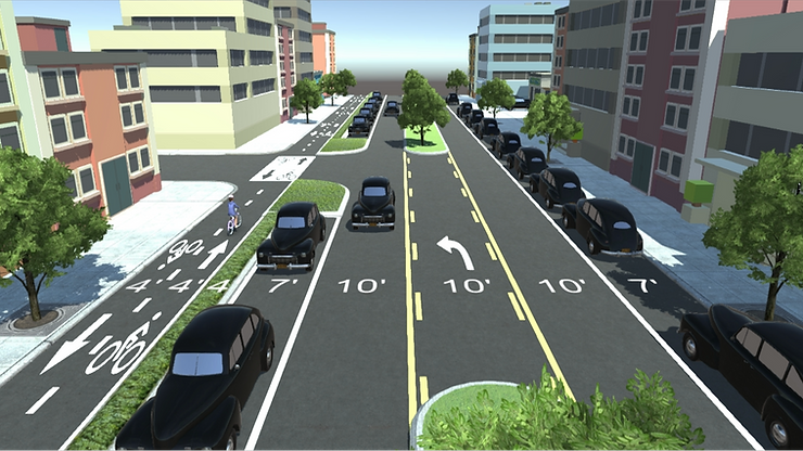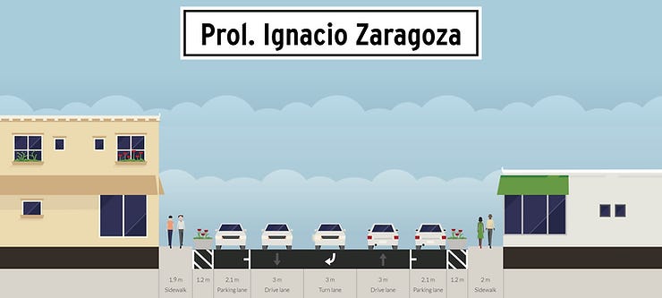 Gracias a las herramientas como Google Maps y StreetMix pude hacer un pequeño corte donde podemos apreciar cómo se podría intervenir este tramo de Zaragoza. Existe el suficiente espacio para un carril de circulación hacia cada sentido y un carril compartido de vuelta a la izquierda. Cada extremo tiene lugar para estacionamiento en paralelo.
