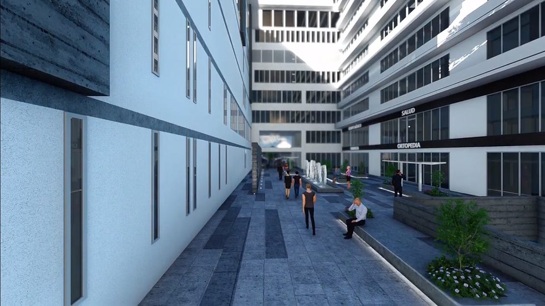 El complejo cuenta con 2 edificios: uno de consultorios y el hospital. El hospital tendrá 6 plantas y la torre de consultorios 14. Ambas construcciones se integran a traves de una plazoleta central que funciona como espacio público y área verde. La torre de consultorios tendrá comercio en sus primeras dos plantas, lo más probable sería que llegara alguna farmacia, tiendas de regalos y cafeterías.