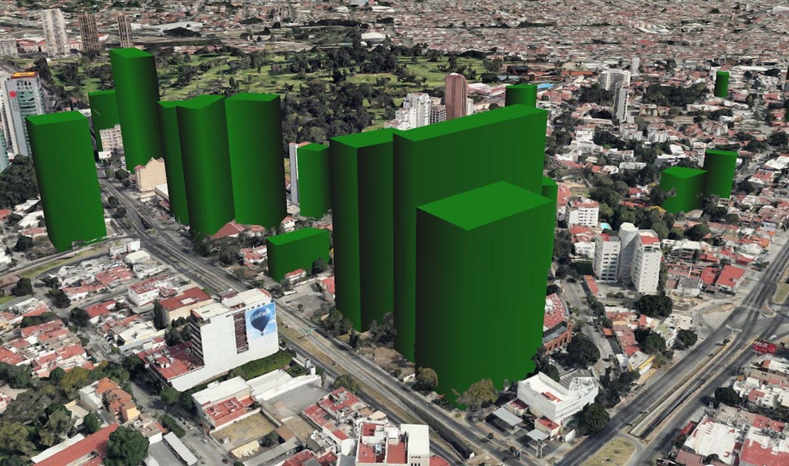 Probablemente la altura ronde alrededor de los 105 metros, lo bueno de esto es que limitará el impacto de su mayor vecina Américas 1254 (la caja de cereal).