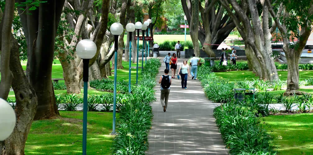 Mi alma máter, su campus tiene un gran trabajo de paisaje, los caminamientos están bien diseñados y tienen mobiliario. Este nivel de cuidado se debería buscar en los espacios públicos.