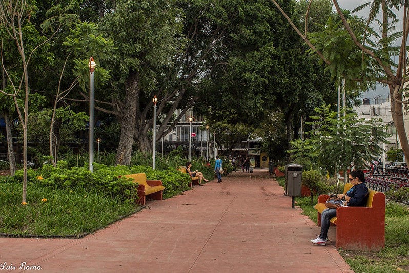 Admito que puedo tener un sesgo por ser tapatío de nacimiento, pero la verdad me encanta como se ve el mosaico. Bien por el ritmo de las franjas rematadas por lo cajetes de los árboles (aunque muy pequeños). Sin embargo falta mobiliario y más adelante hay que esquivar el arbolado.