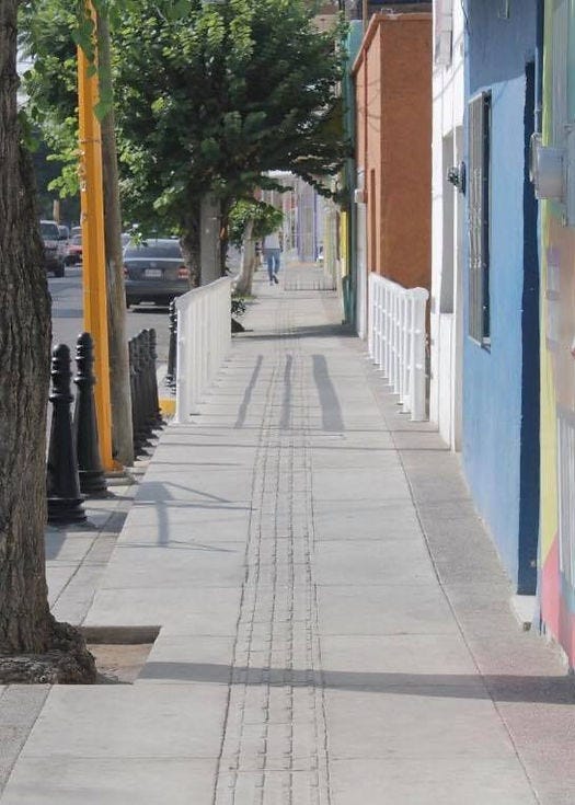 En Aguascalientes podemos ver que se ha implementado el programa de banqueta segura. Que, aunque tiene gran oportunidad de mejora, se puede ver que tiene algunos elementos estéticos que le ayudan (franjas un poco más oscuras antes del machuelo y junto al inicio de las propiedades.