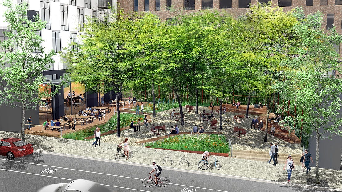 El parque tendrá un área de 600 metros cuadrados. Por sus dimensiones los podríamos considerar un gran parque de bolsillo. Los otros 300 metros del solar serán ocupados por un edificio de usos mixtos de 6 plantas. El programa del edificio contiguo que incluye oficinas, escuelas y locales ayudará a mantener la vitalidad del parque. El proyecto es desarrollado por Perímetro Propiedades.