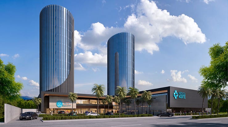 Un pequeño Stripmall junto con un hospital y al parecer dos torres corporativas de 12 pisos, lo más probable es que las torres sean para consultorios.