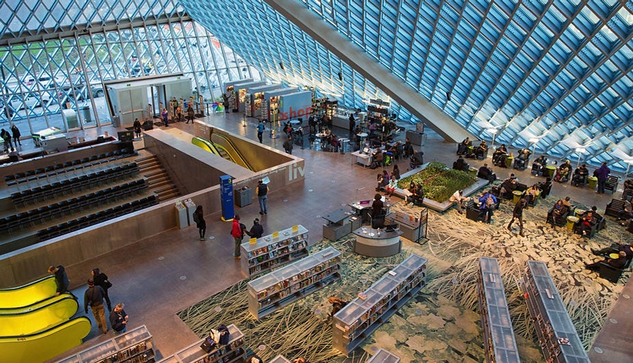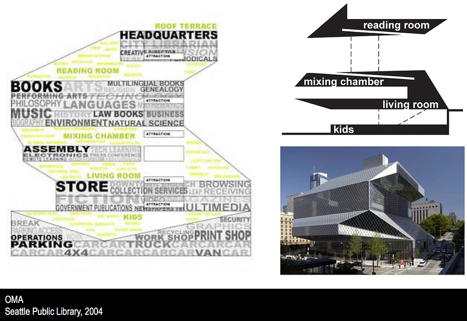 Por ejemplo, veamos la Biblioteca Pública de Seattle. Este edificio es obra de Rem Koolhaas y su despacho OMA. Esta fue terminada en 2004 y se ha vuelto uno de los edificios más icónicos de Seattle.