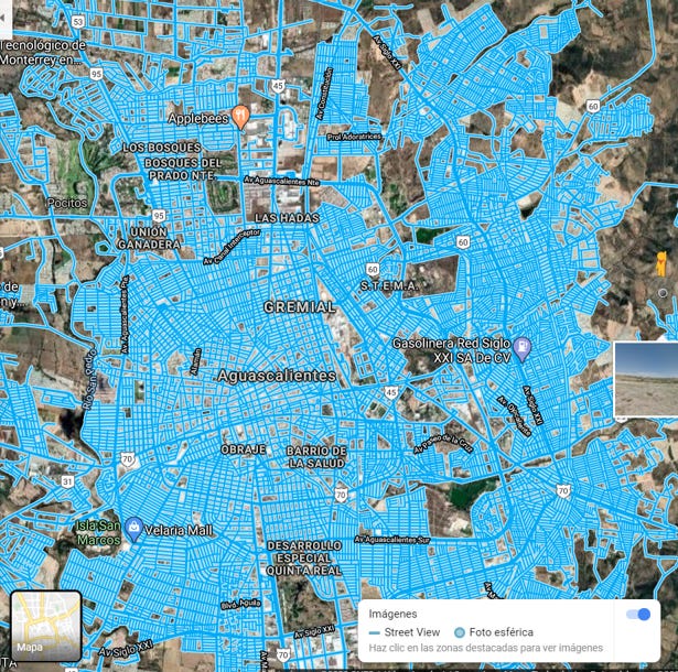 El problema (y dónde está la solución) es que muchas de estas supermanzanas son los parques urbanos. Aunque también hay otras, como Sensata, la zona militar, el ITA y el complejo FicoTrece. De hecho lo podemos ver en google maps, en azul se muestran las calles públicas, las mismas donde StreetView está disponible.