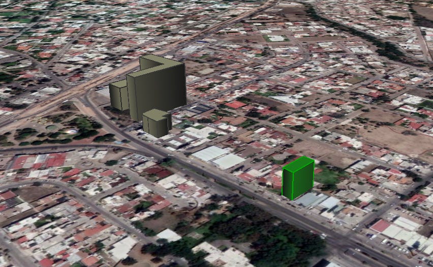 Para demostrar esto les dejo un pequeño diagrama que aprendí a hacer en Google Earth, creo que nos ilustra mucho sobre el impacto de los nuevos edificios en la ciudad. El complejo MAC Aguascalientes Norte y la torre médica Okabe están de gris, mientras que Colosio 1006 se ve de verde.