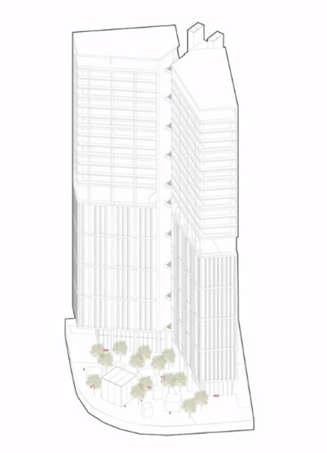 Y qué mejor manera para aprovechar los nuevos flujos peatonales con la construcción de un nuevo edificio con gran integración a la calle y el espacio público. Esto se lograría con una explanada-parque que es envuelta por la torre a la cual se ingresa por un Lobby de generosa altura.