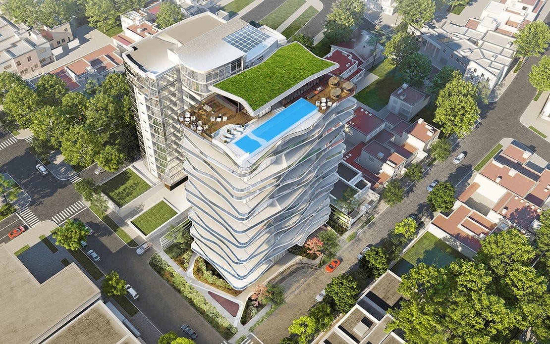 El despacho encargado de proyectar el edificio es Varabyeu Partners. La desarrolladora es Promodesa. El diseño contempla 15 niveles. En la primera planta encontramos un elegante vestíbulo a doble altura que los pisos de departamentos. En la última planta están las amenidades como las áreas comunes y una alberca. Me imagino que se tendrá muy buena vista en este sitio hacía los rascacielos de #Guahattan.