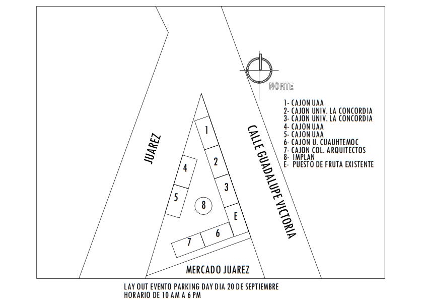 La esquina norte del mercado Juárez fue intervenida con motivo de celebración del Parking day (día del estacionamiento en español). El principio detrás de este movimiento es recuperar el espacio público que se dedica como cajones de estacionamiento.