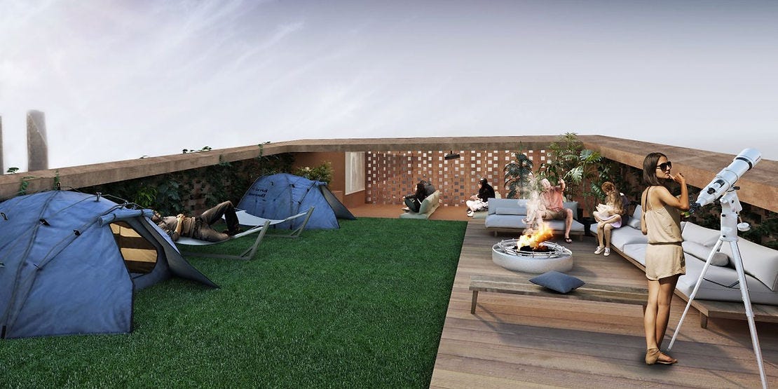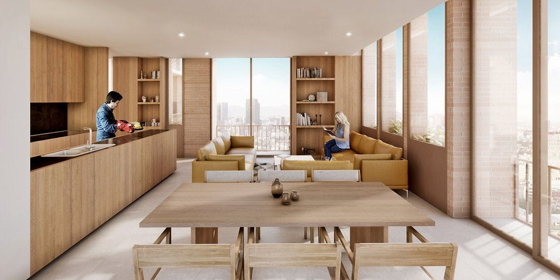 No encontré el precio precio de los departamentos. Estos tendrán un área de entre 105 y 170 m^2. Tendrá espacios para bicicletas y estacionamientos techados. Lo más interesante en cuanto amenidades me parece el jardín en la parte superior de la torre, que seguramente tendrá unas vistas envidiables de la ciudad.