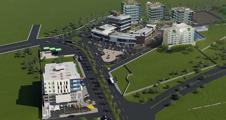 El proyecto consta de 4 edificios corporativos (el más pequeño se había construido desde la etapa pasada), un pequeño centro comercial, una torre departamental (leer más aquí), consultorios médicos, una pista de hielo en construcción y un área verde central entre la zona comercial y corporativa.