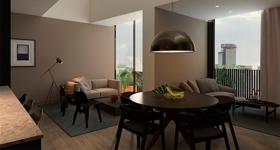 Calculo que la torre tendrá 90 departamentos. 6 por planta en 15 pisos de uso residencial. Se ofertan tres modelos de departamentos con dimensiones de 50, 75 y 100 metros cuadrados. Todos de dos recamaras a excepción de los de 50 metros cuadrados que solo tendrán una habitación. Parece que los baños no tendrán ni iluminación ni ventilación natural.