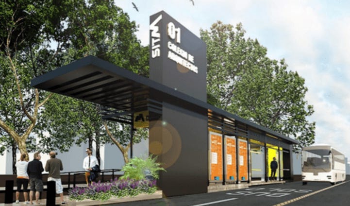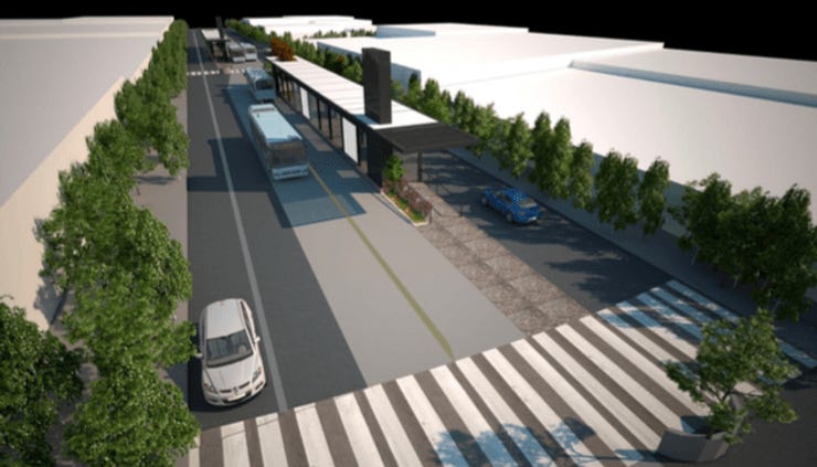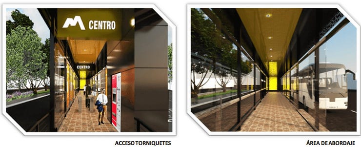 Las estaciones se encuentran en el centro del camellón, parece que no todos los ejes viales contarán con este tipo de infraestructura y los que lo hagan tampoco será a lo largo de toda su ruta. Entiendo que se implementará en los sitios con las mayores demandas. Supondré que los paraderos serán similares a los colocados municipio.