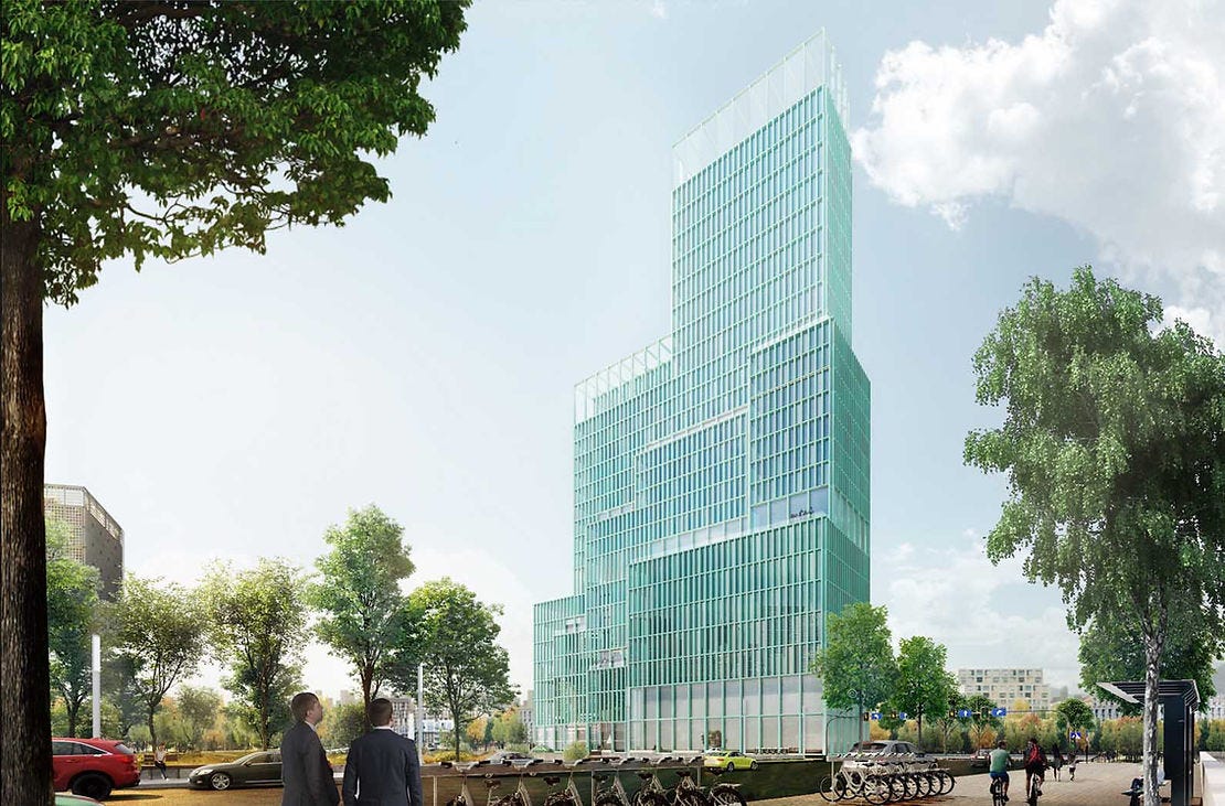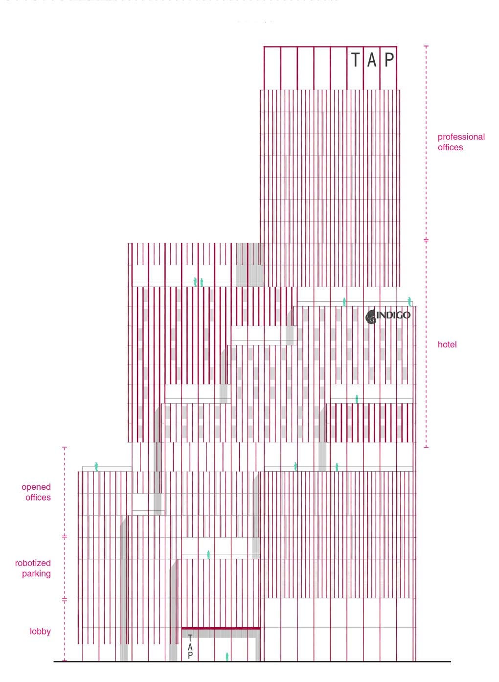 El diseño resultó de una colaboración del despacho madrileño Estudio Herreros y el tapatío Divece Arquitectos. La fachada es de cristal y el edificio se compone de un juego de volúmenes escalonados. El programa arquitectónico incluye espacios para estacionamientos, comercio a nivel de calle, oficinas y un hotel Indigo, todo esto en 24,000 metros cuadrados de construcción.
