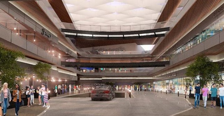 El centro comercial será de un tamaño destacable. Aunque aún no sepamos exactamente cuán grande será, si podemos observar tres plantas a doble altura con bastantes locales y puentes que comunican ambos lados.