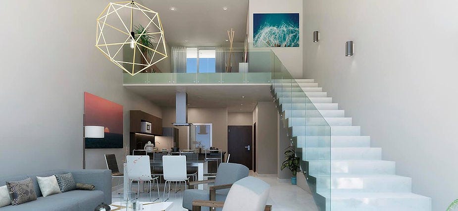 Volviendo al tema de Tramonto, se ofrecen dos tipos principales de unidades, los Lofts y las Suites. Ambas de dos niveles. Esto tiene varias virtudes, pues se reducen las circulaciones públicas (con pasillos cada dos niveles en vez de cada nivel) y además permite los cambios en sección (la altura de suelo a techo).