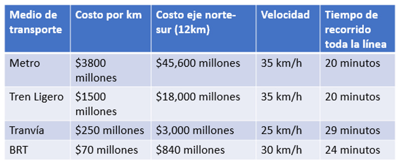 Cerremos el total en $3,350 millones de pesos, o su equivalente en dolares estaría cercanos a los $180 millones de USD. Aquí una tabla aproximada de los costos y velocidad de distintos medios de transporte (Aunque estos varían mucho de proyecto a proyecto).