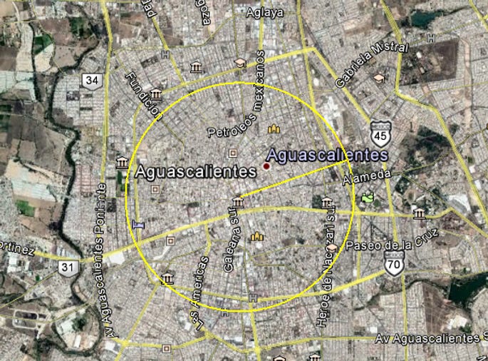 400 bicicletas significarán entre 50 y 60 estaciones probablemente. Con distancias promedio de 450 metros entre estación y 0.2 kilómetros cuadrados de área de influencia el área total de cobertura (con 55 estaciones) sería de 11 kilómetros cuadrados (corriganme si detectan un error en mi calculos), quizá este número sea algo difícil de entender, mejor veamos un mapa centrado en la Exedra. Básicamente cubre todo el interior de primer anillo exceptuando el área al oriente de Gómez Morín pero dentro del primer anillo.