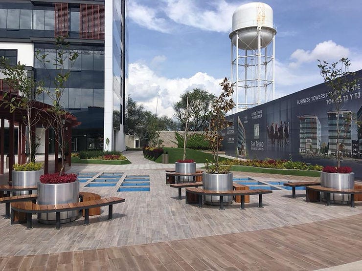 Lo que más me gusta de este proyecto son los jardines y áreas públicas, si bien mi posición personal sobre el diseño de exteriores es distinta (soy más "cuadrado" y regionalista) la importancia de estos como el eje rector y su buen resultado es indudable. Me parece que se extiende de muy buena manera el jardín del centro comercial hacia la zona corporativa.