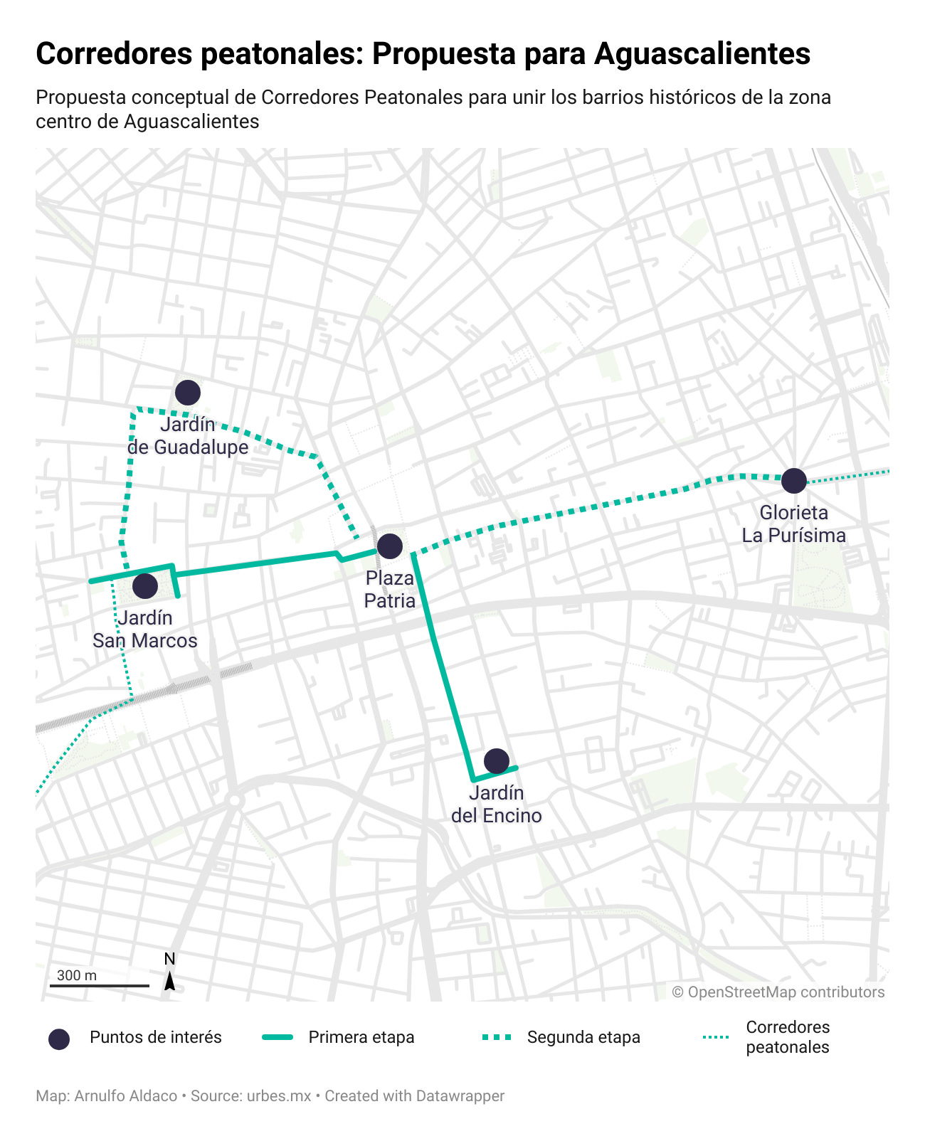Pero yo me pregunto ¿Por qué no pasa esto con los otros barrios históricos de la ciudad? La distancia entre el Jardín del Encino o el de Guadalupe hasta la Plaza Patria es muy comparable, de alrededor de 600 metros. En el caso del Barrio de la Estación, de la Purísima o de la Salud las distancias son mayores, pero también son razonables de caminar. Quizá el lector ya presienta lo que quiero proponer: una red de andadores entre los barrios de la ciudad.
