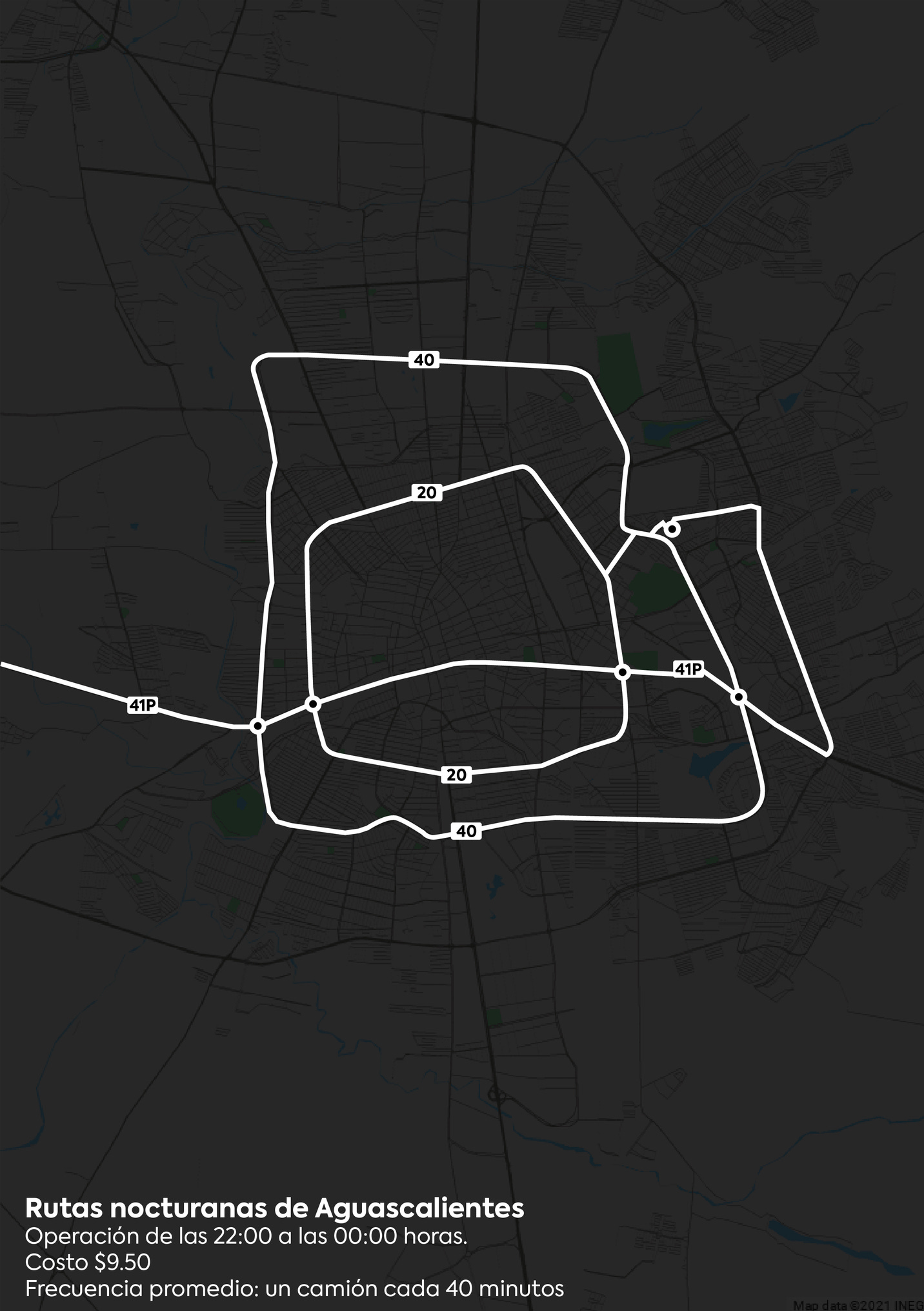 Finalmente creo que se debería de hacer un nuevo “branding” para los servicios nocturnos, de manera que no confunda a usuarios de los diferentes servicios. Por ejemplo, al día de hoy la ruta 41 es un poco más corta en su servicio nocturno, lo cual puede desorientar al usuario y hacerlo perder el autobús.