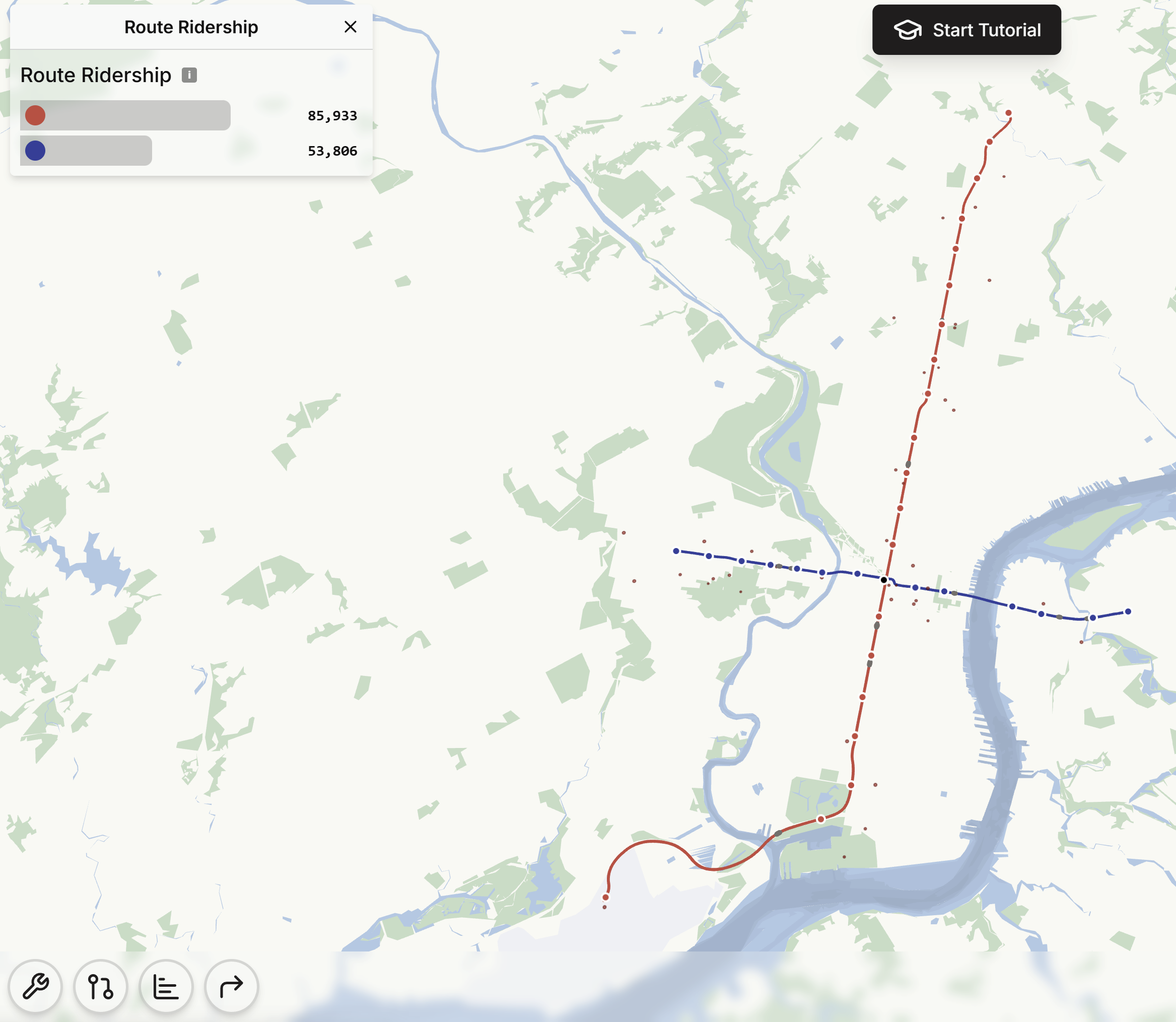 Ok, regresemos a nuestra partida en Filadelfia. Teníamos una línea norte-sur bastante exitosa ¿Qué crees que pasaría si agregáramos una línea corta este-oeste?