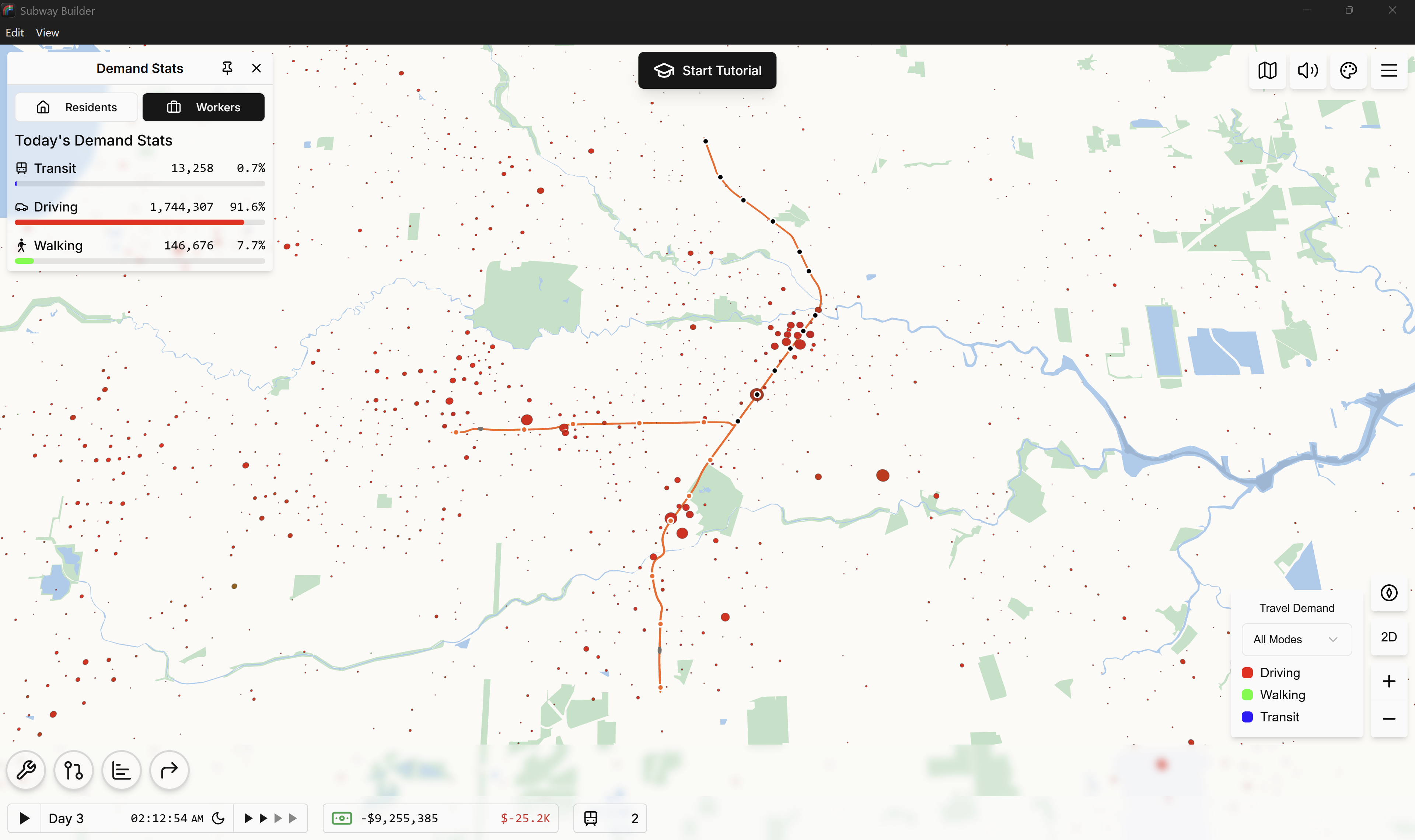 Como referencia, construí una línea completamente subterránea de metro pesado (nivel –5 m para todas las estaciones) y mantuve la tarifa predeterminada de $3.00 en ambos casos.