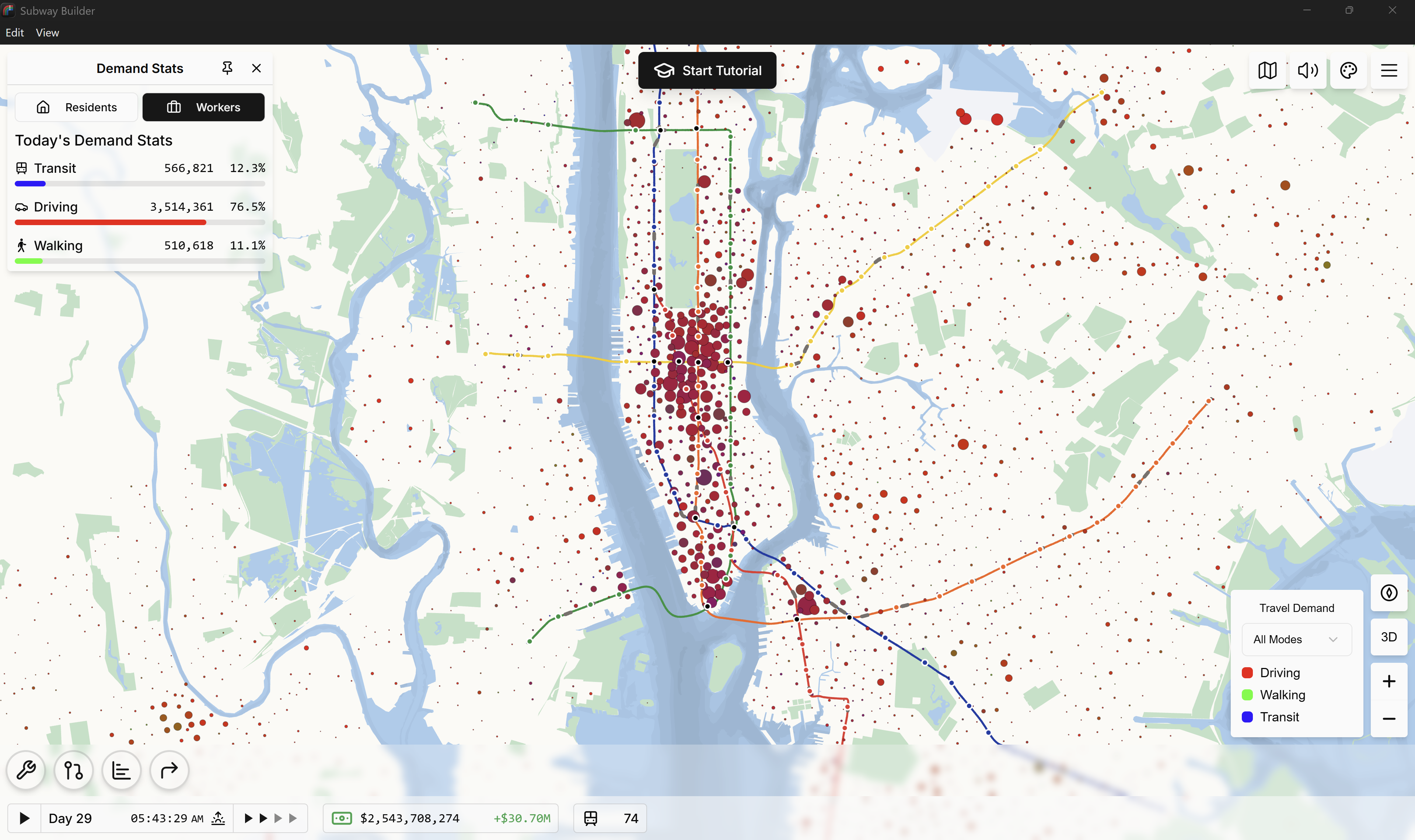 Jugar Subway Builder en Nueva York rápidamente muestra qué tan profundamente la ciudad está moldeada por el transporte, y qué tan fácil es operar líneas rentables y financiar expansiones.